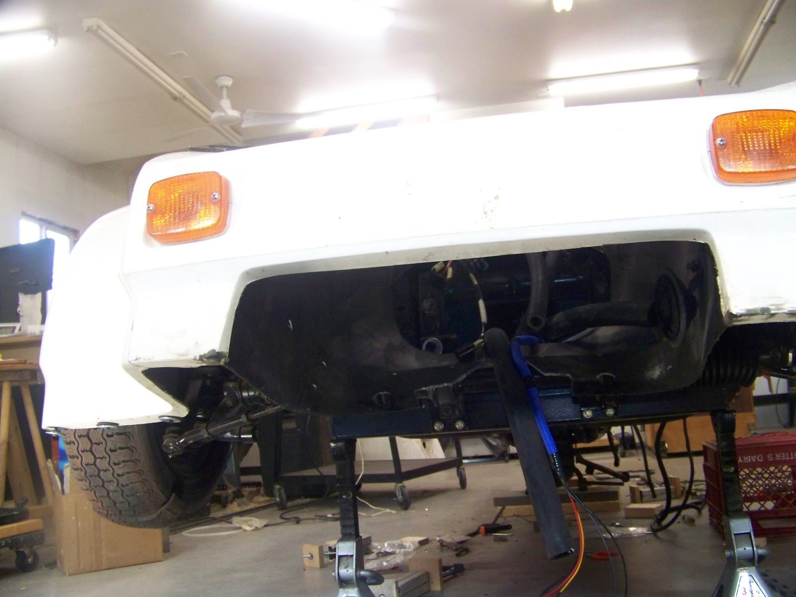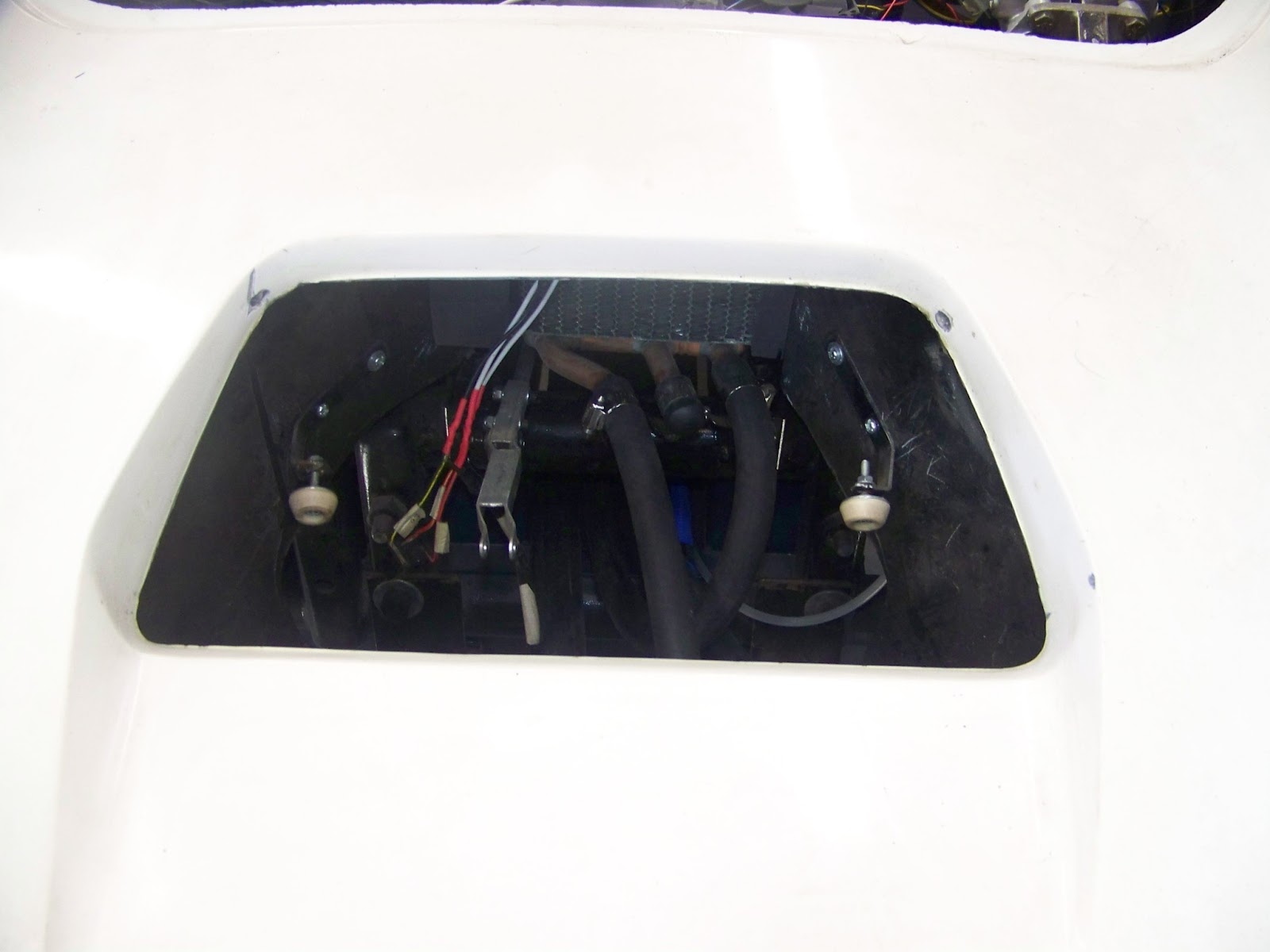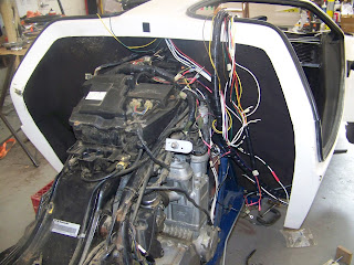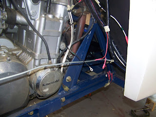 The picture above shows where I am going to relocate the battery. I still need to make a the battery tray and then attach it to the blue frame between the engine and the body.