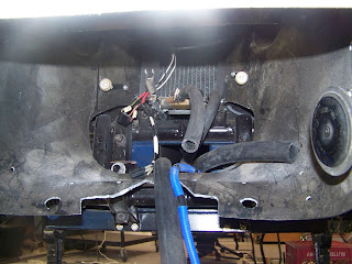 Above is a view of the front end where the radiator goes; below is a closeup. You can see the hoses that connect to the radiator (the heater core out connects to the bottom of the radiator where the return hose connects. These pictures really do not do justice to how tight it is). You can also see the horn on the right.