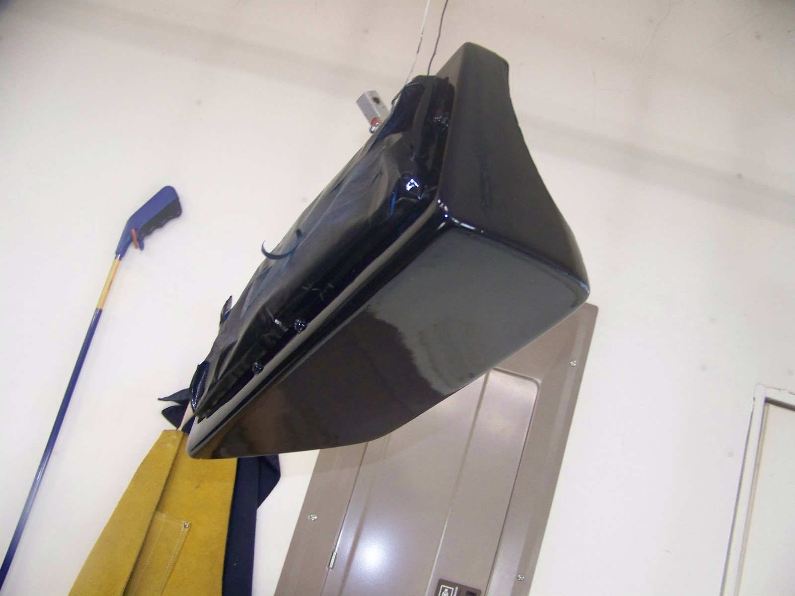 Above is the painted headlight bucket (hanging while it dries). Below is where it goes. You cans see the heater core connections, as well as the headlight wiring, linkages, and down stops.